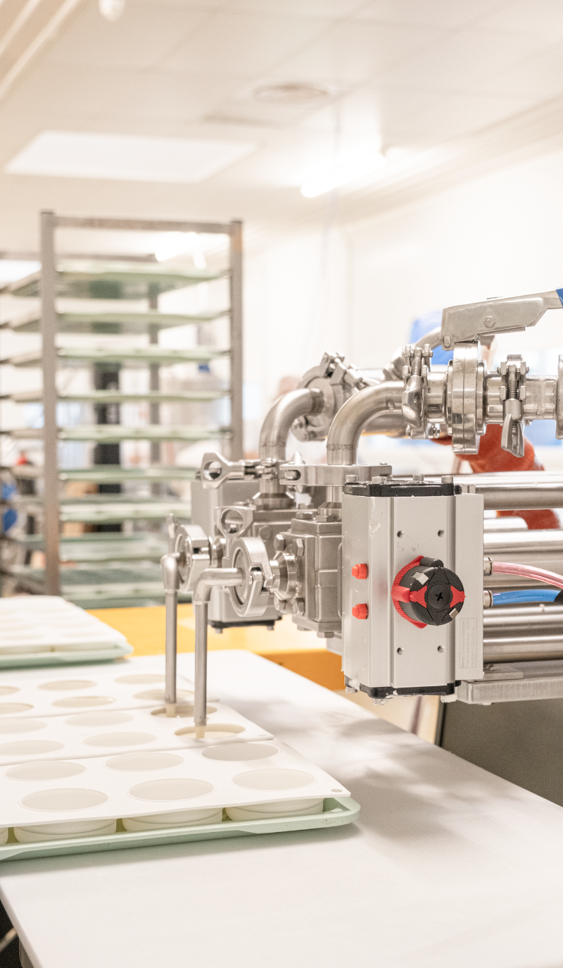 - Une ligne de conditionnement équipée d’un tunnel de refroidissement (positif - négatif) ainsi que d’une lampe à Infrarouge destinée à réchauffer le produit après son passage dans le tunnel de refroidissement